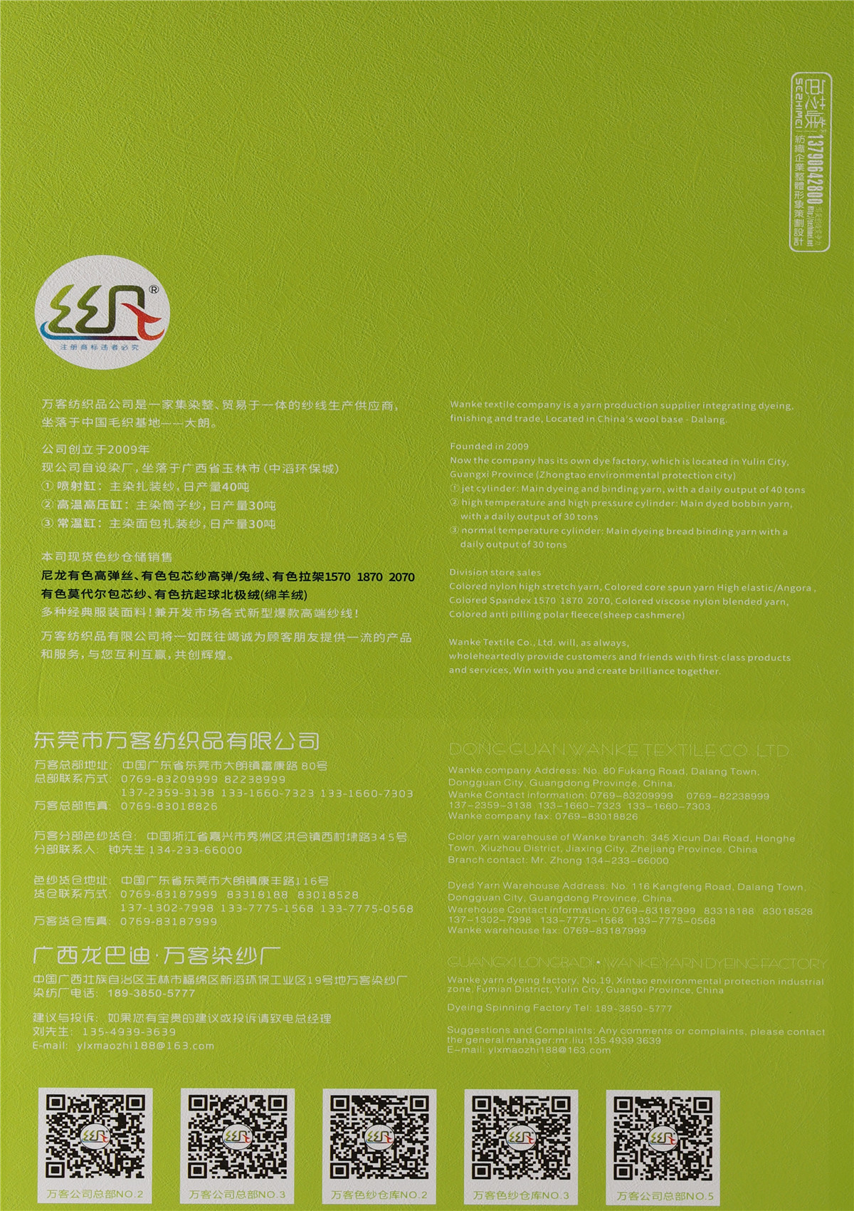 主营:纺染一体,批发生产锦纶有色高弹丝,抗起球北极绒(绵羊绒)兔绒包芯纱,高弹包芯纱,有色拉架