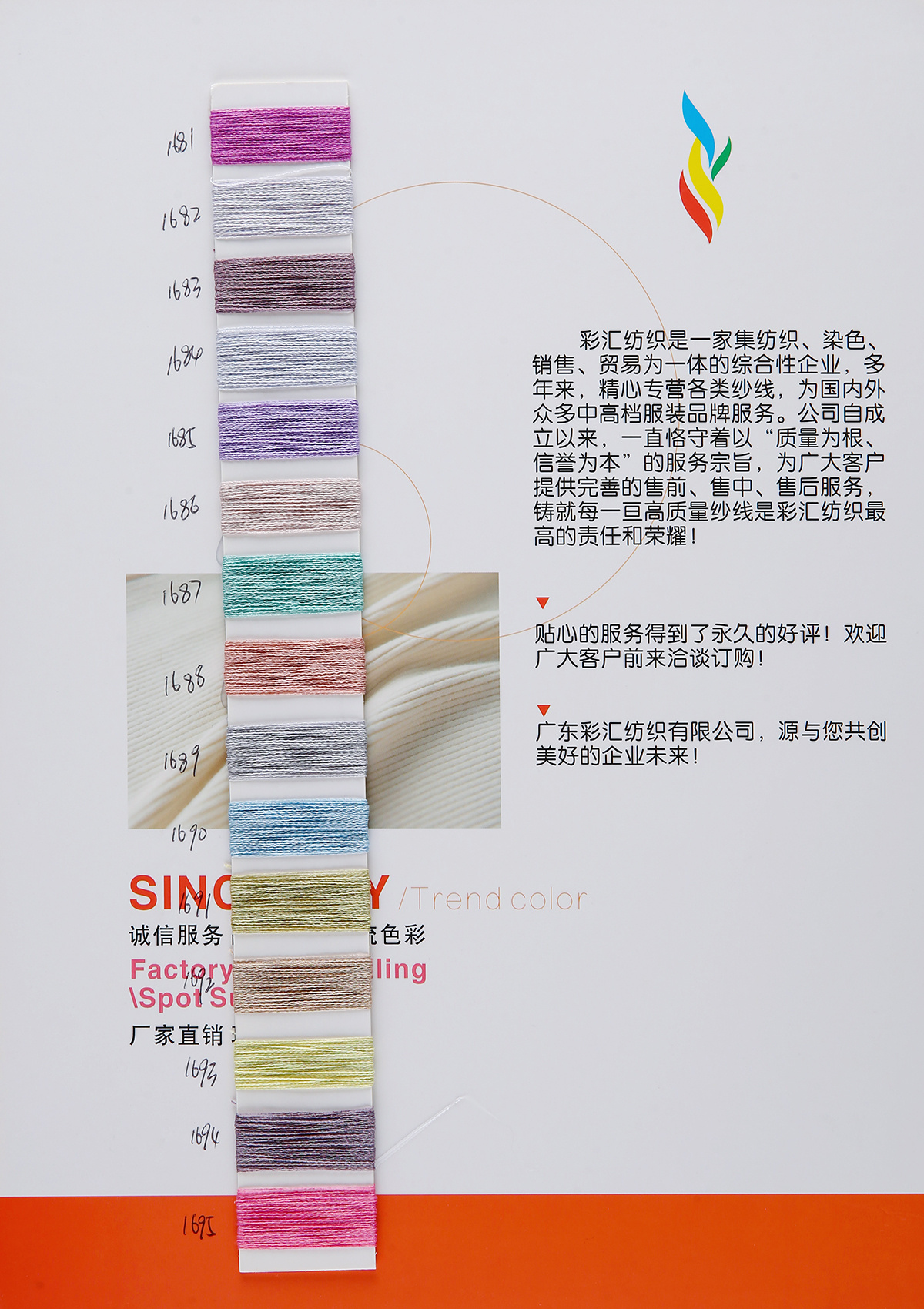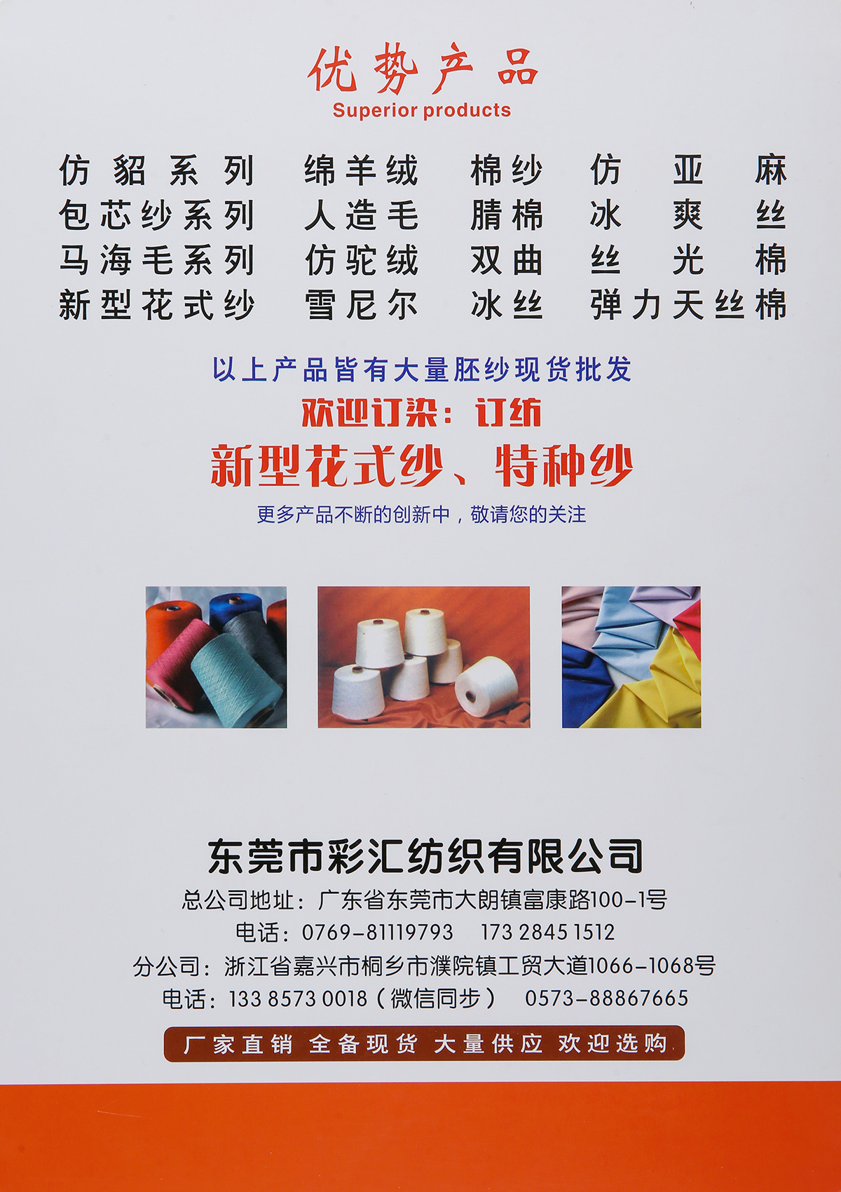 主营:自设染纺厂-现货色纱;抗起球包芯纱、磨毛绒、圈圈纱、拉毛纱、北极绒、冰丝、花式纱;