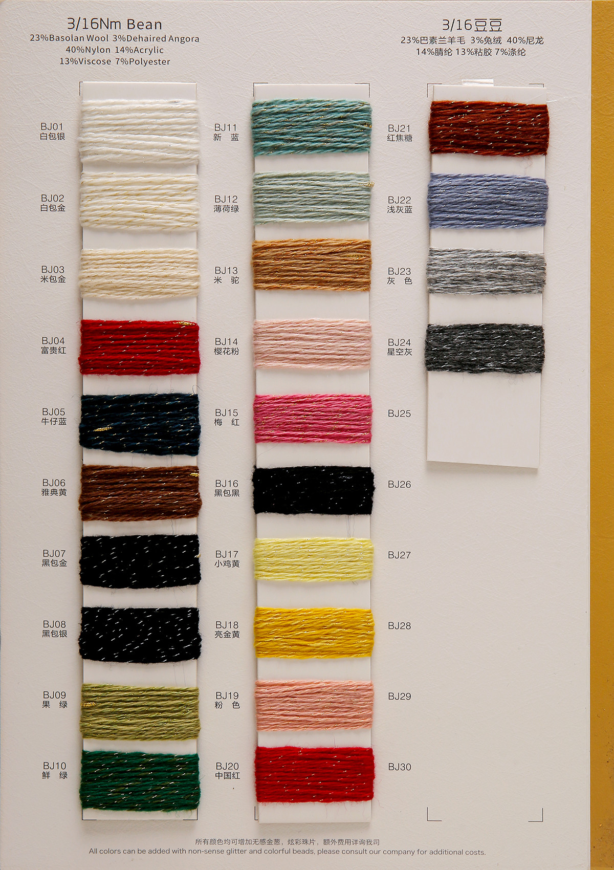 23%巴素兰羊毛 3%兔绒 40%尼龙 14%腈纶 13%粘胶 7%涤纶