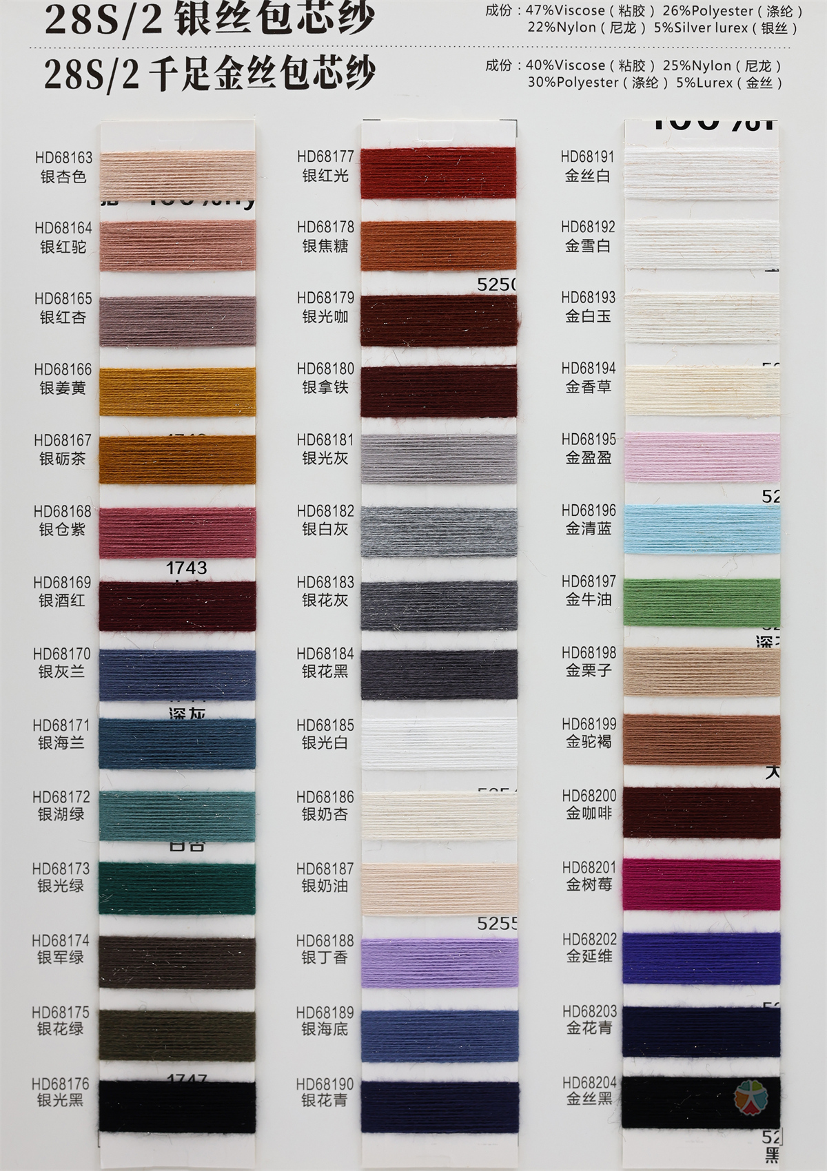 47%粘胶 26%涤纶 22%尼龙 5%银丝/40%粘胶 25%尼龙 30%涤纶 5%金丝
