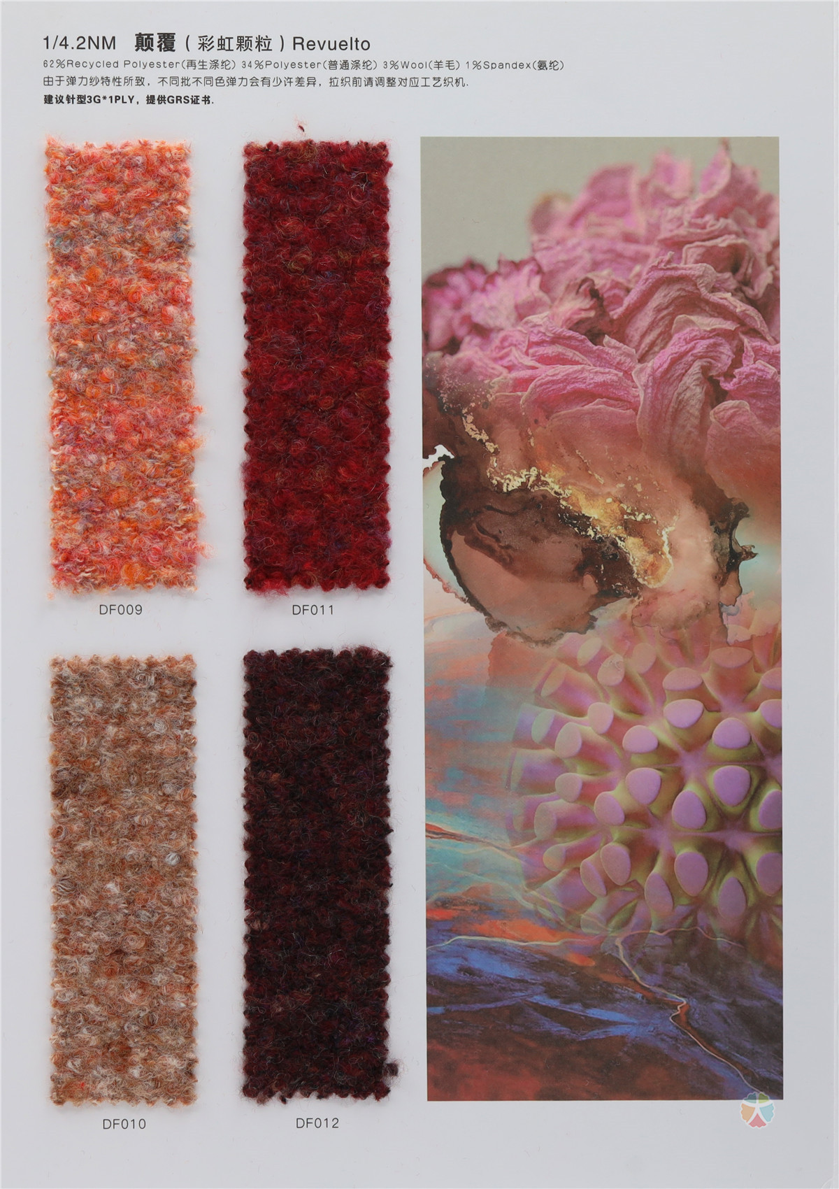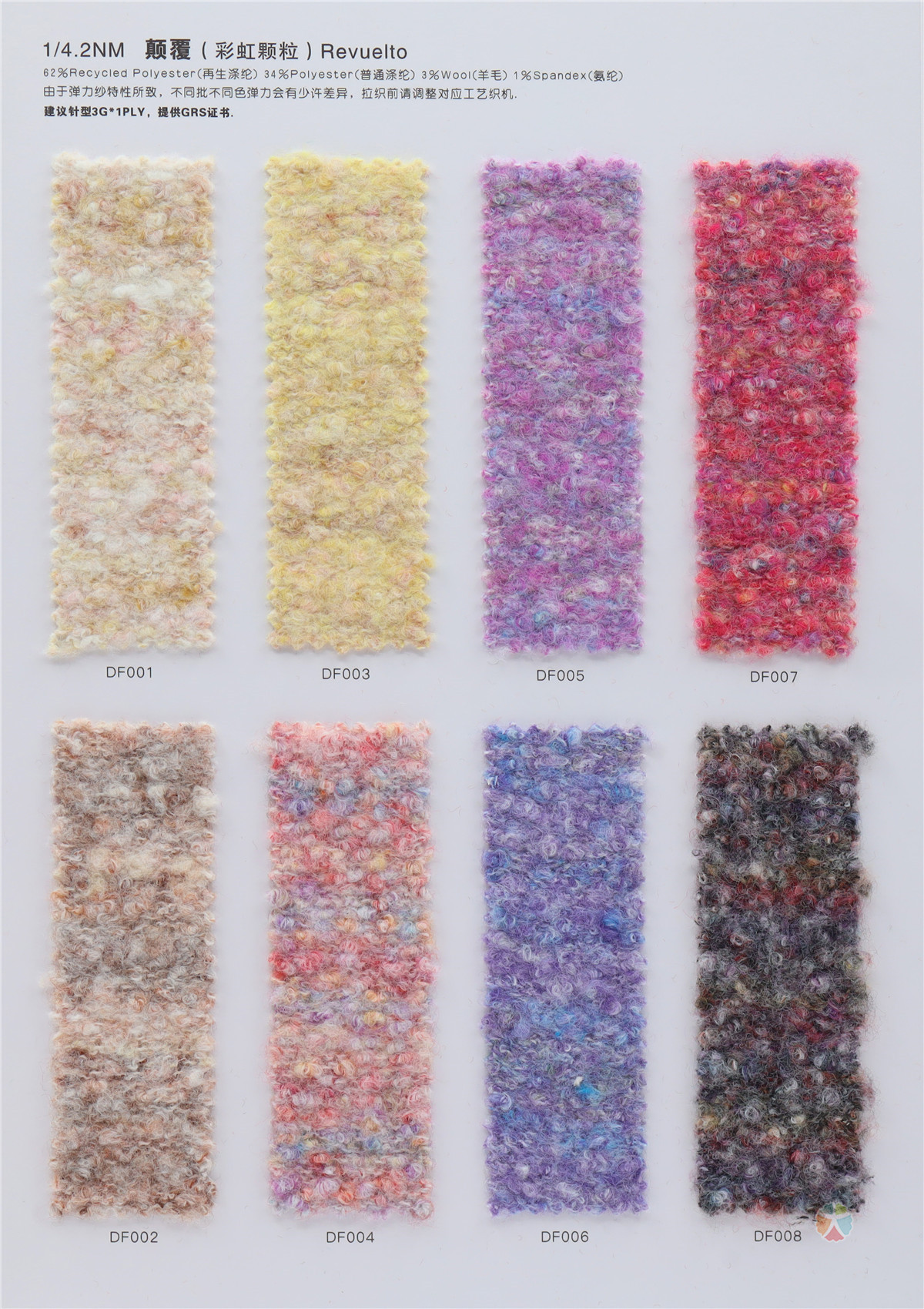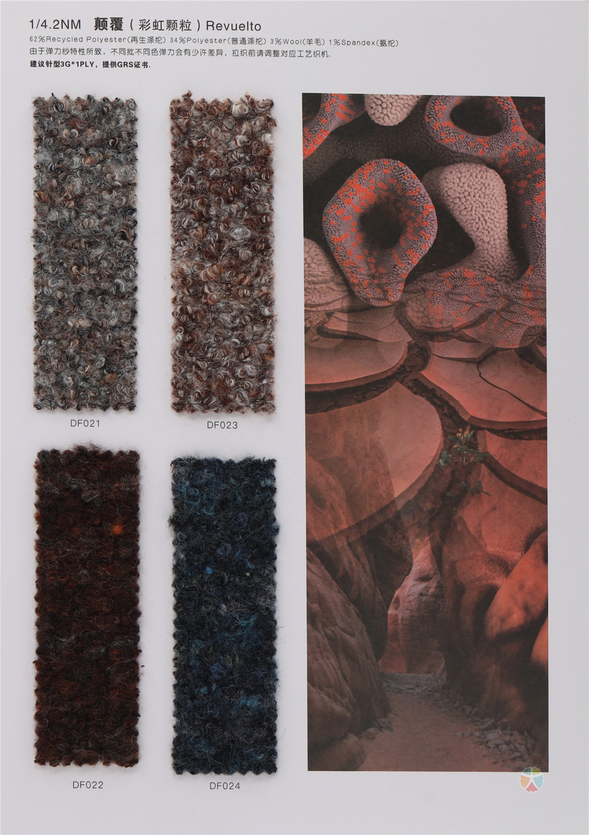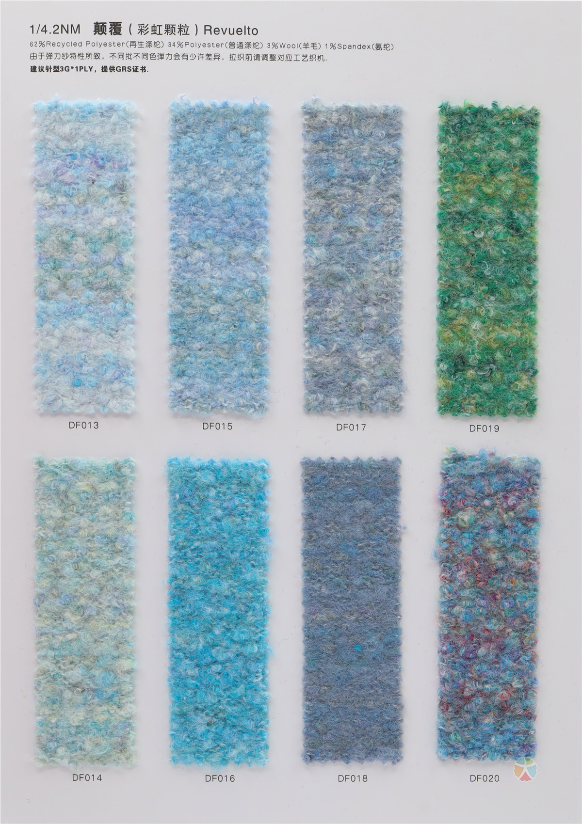 62%Recycled Polyester(再生涤纶) 34 %Polyester(普通涤纶) 3%Wool(羊毛) 1%Spandex(氨纶)