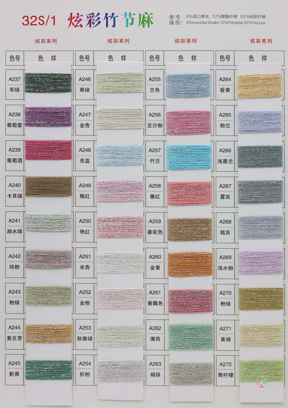 主营:32/1 超爽竹节麻、1/40NM 超细圣爽丝 (亲肤麻丝)、1/19Nm天爽亚麻、1/24Nm亚麻天丝、52S/1 超细亚麻丝、32S/1 莱赛尔丝绸、1/40NM 超细闪光丝 (银爽丝)