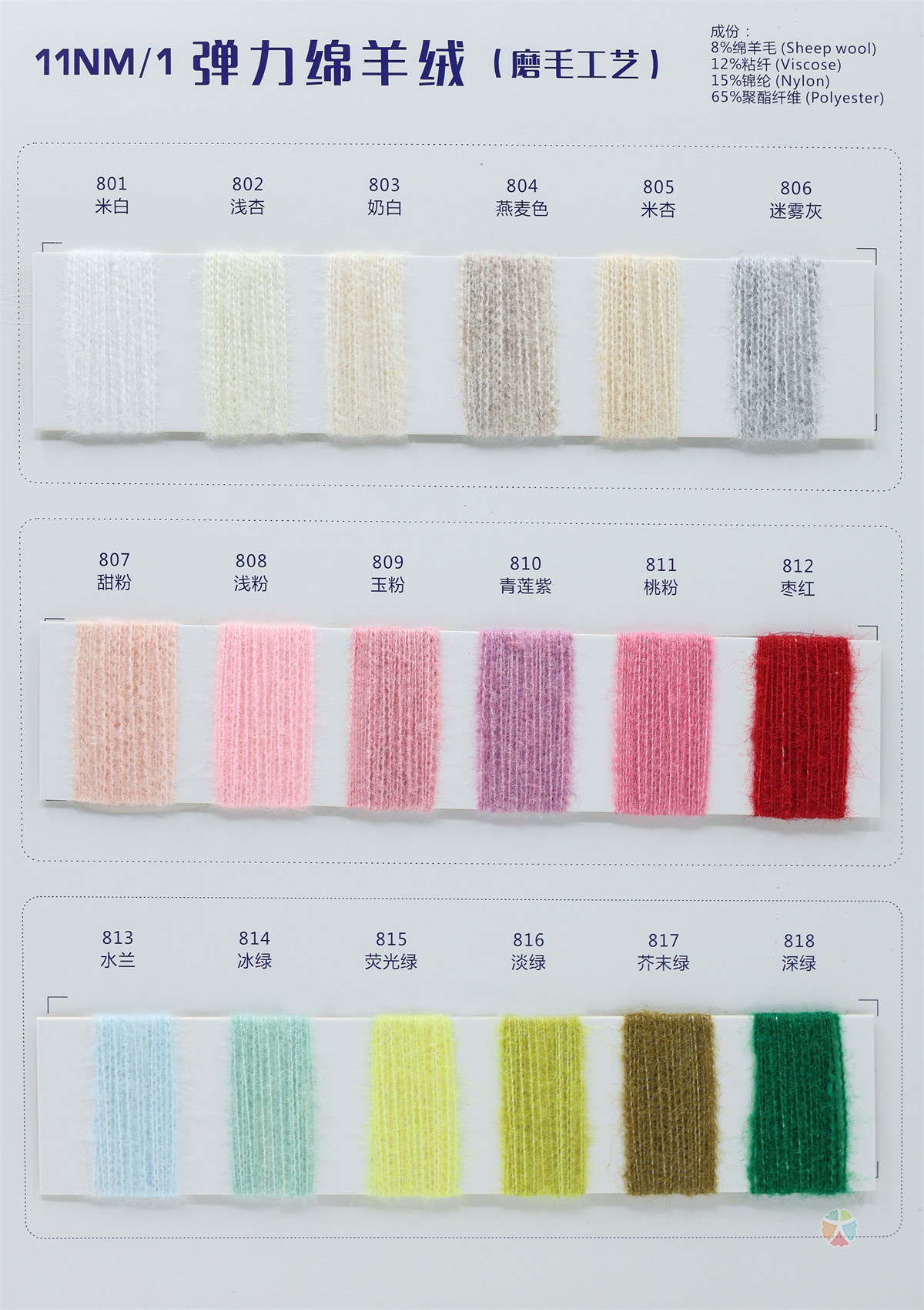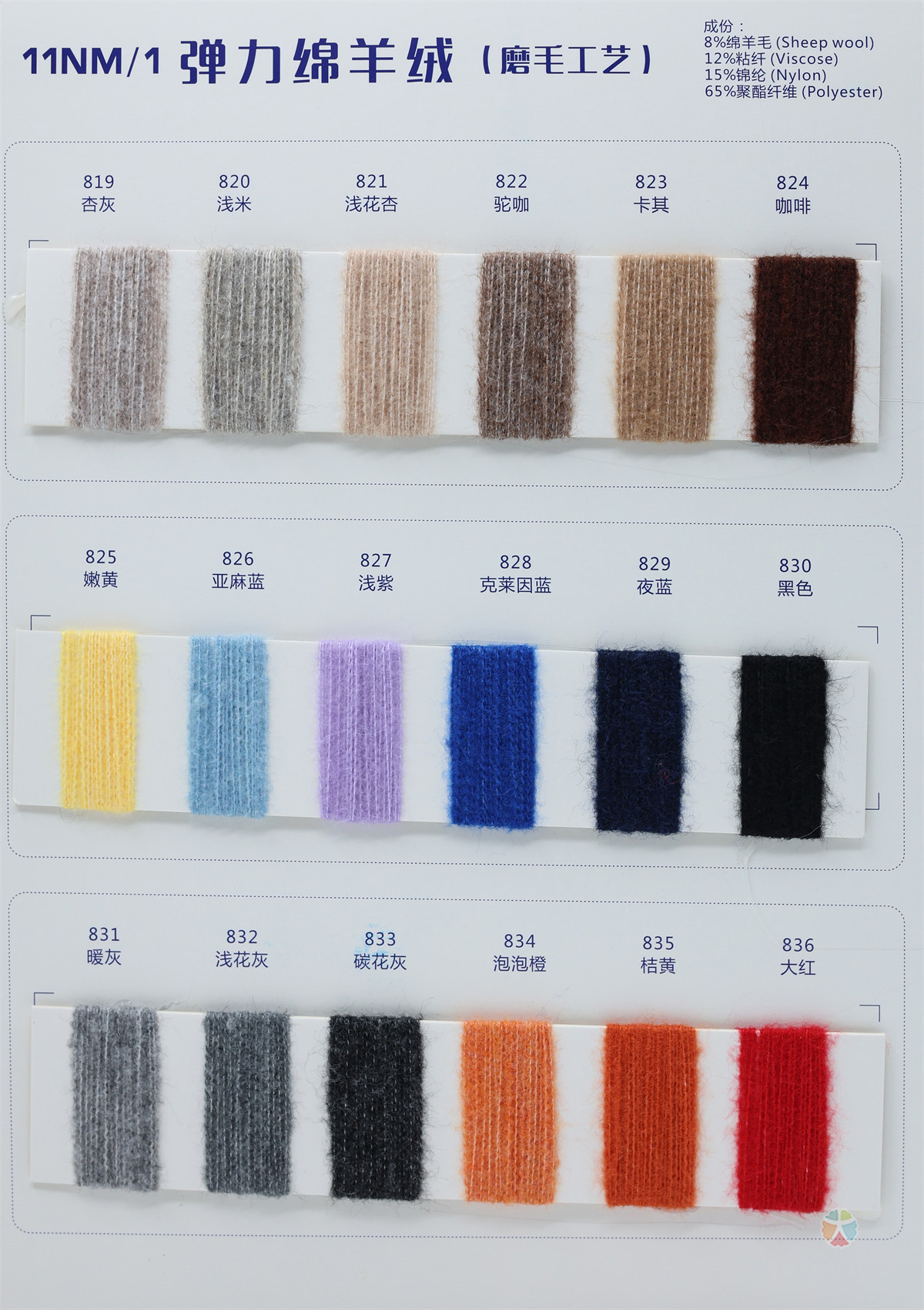 8%绵羊毛 12%粘纤 15%锦纶 65%聚酯纤维