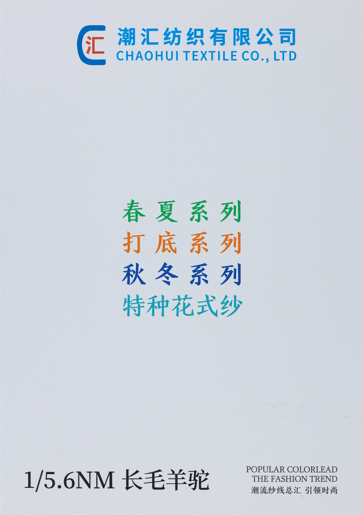 主营:潮汇纺织有限公司:包芯纱系列,短貂.银貂.黄金貂.长毛水貂绒.兔毛兔绒系列,羊毛羊绒系列,马海毛系列,空心带子纱系列,冰岛毛,圈圈纱,闪光纱,小肚纱,大肚纱,斜毛纱,单面绒,双面绒,竹节纱,彩点纱,水结珠,米粉纱,冰曲,仿貂绒,蜈蚣纱,羽毛纱,渐变纱,猫毛纱,丝绒,雪花点,香肠纱,松树纱