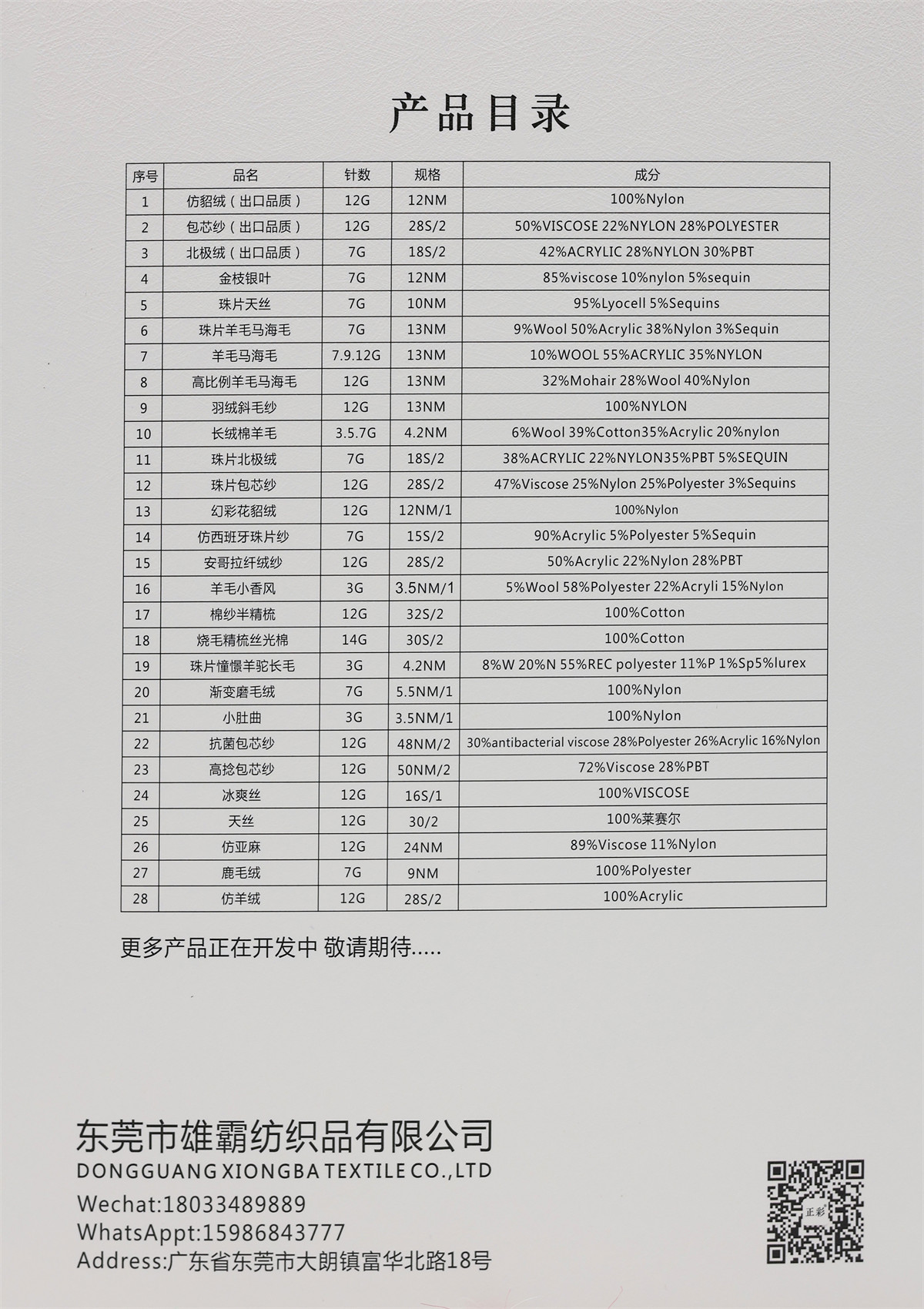 主营:高品质纱线,外贸订单加工,无水份!包芯纱系列,仿貂毛系列,磨毛纱系列;马海毛系列;羊毛系列染厂、摇纱厂、打毛厂、一体化生产、销售