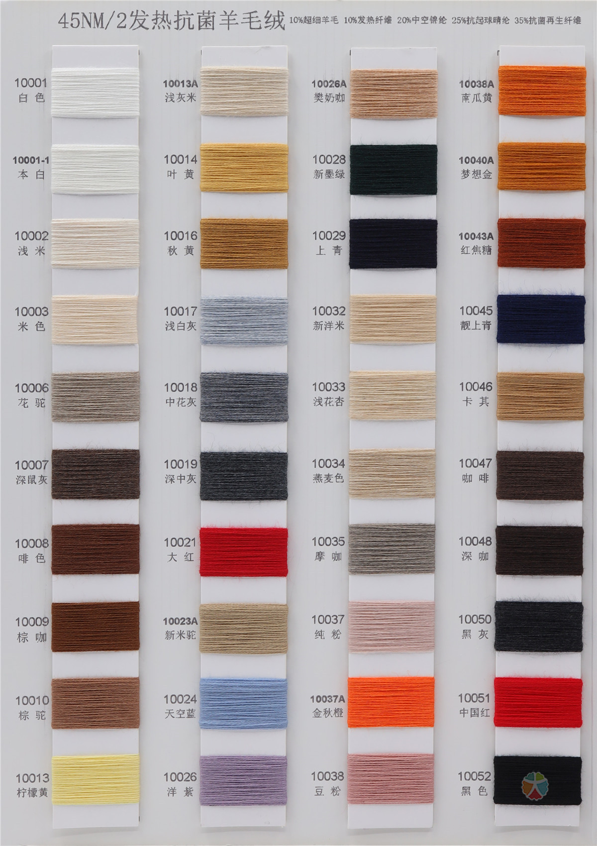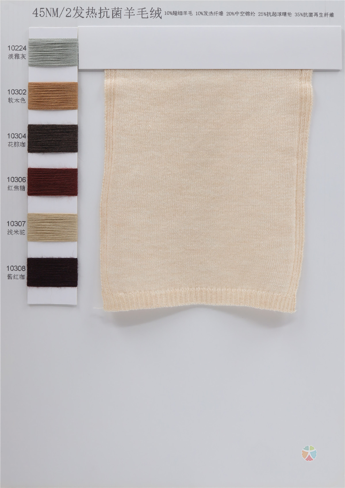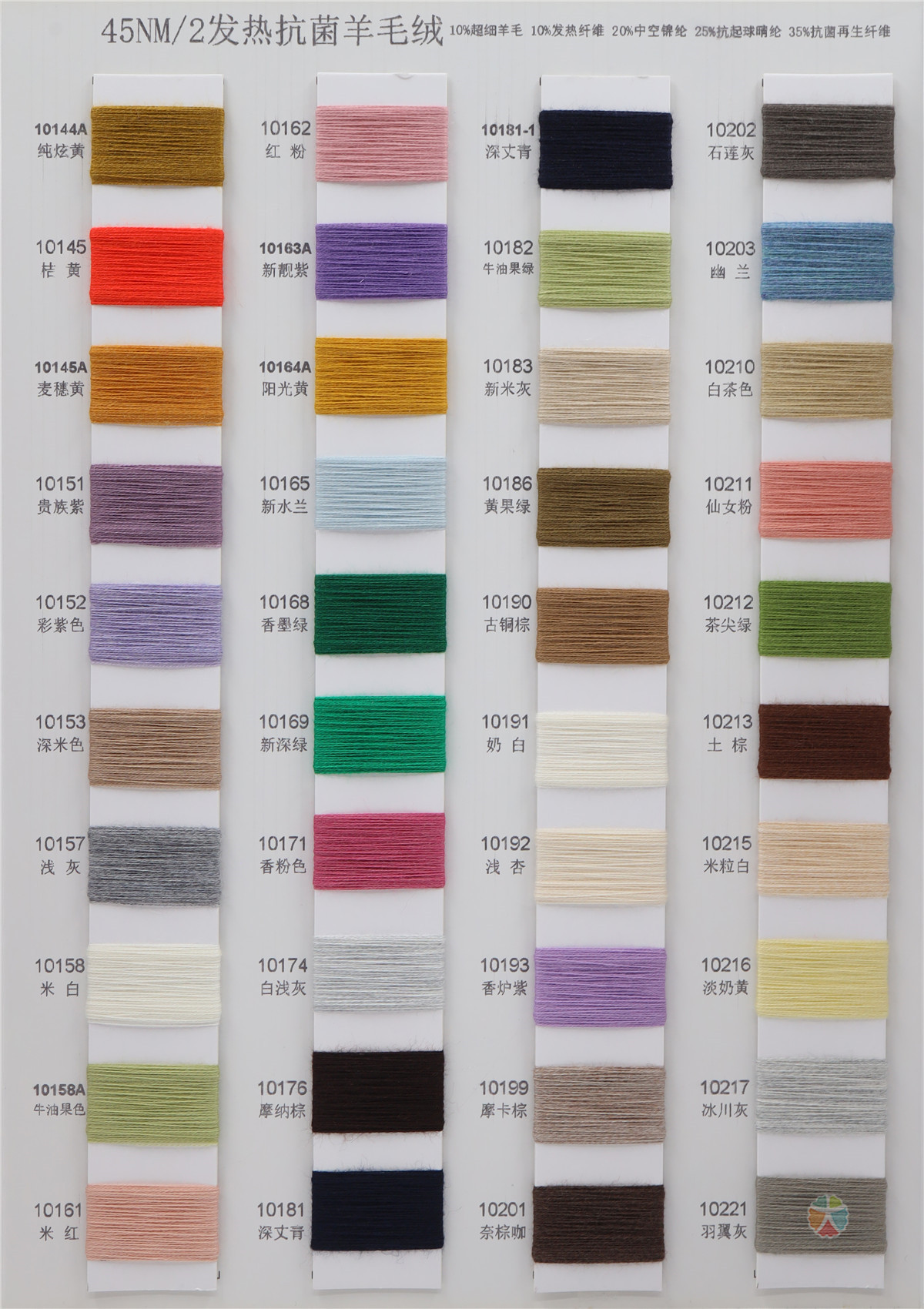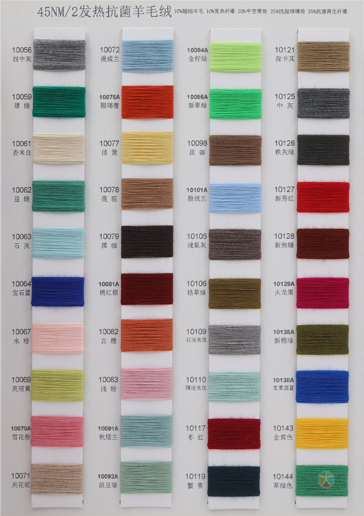 10%超细羊毛 10%发热纤维 20%中空锦纶 25%抗起球晴纶 35%抗菌再生纤维