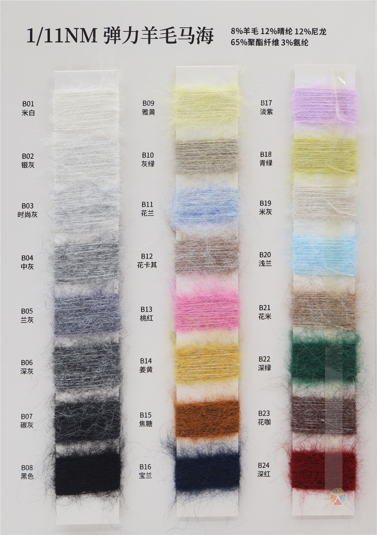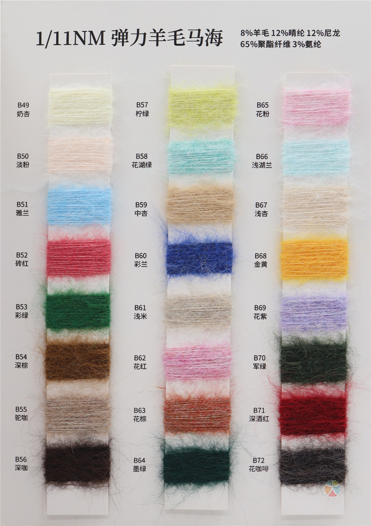 8%羊毛 12%晴纶 12%尼龙 65%聚酯纤维 3%氨纶
