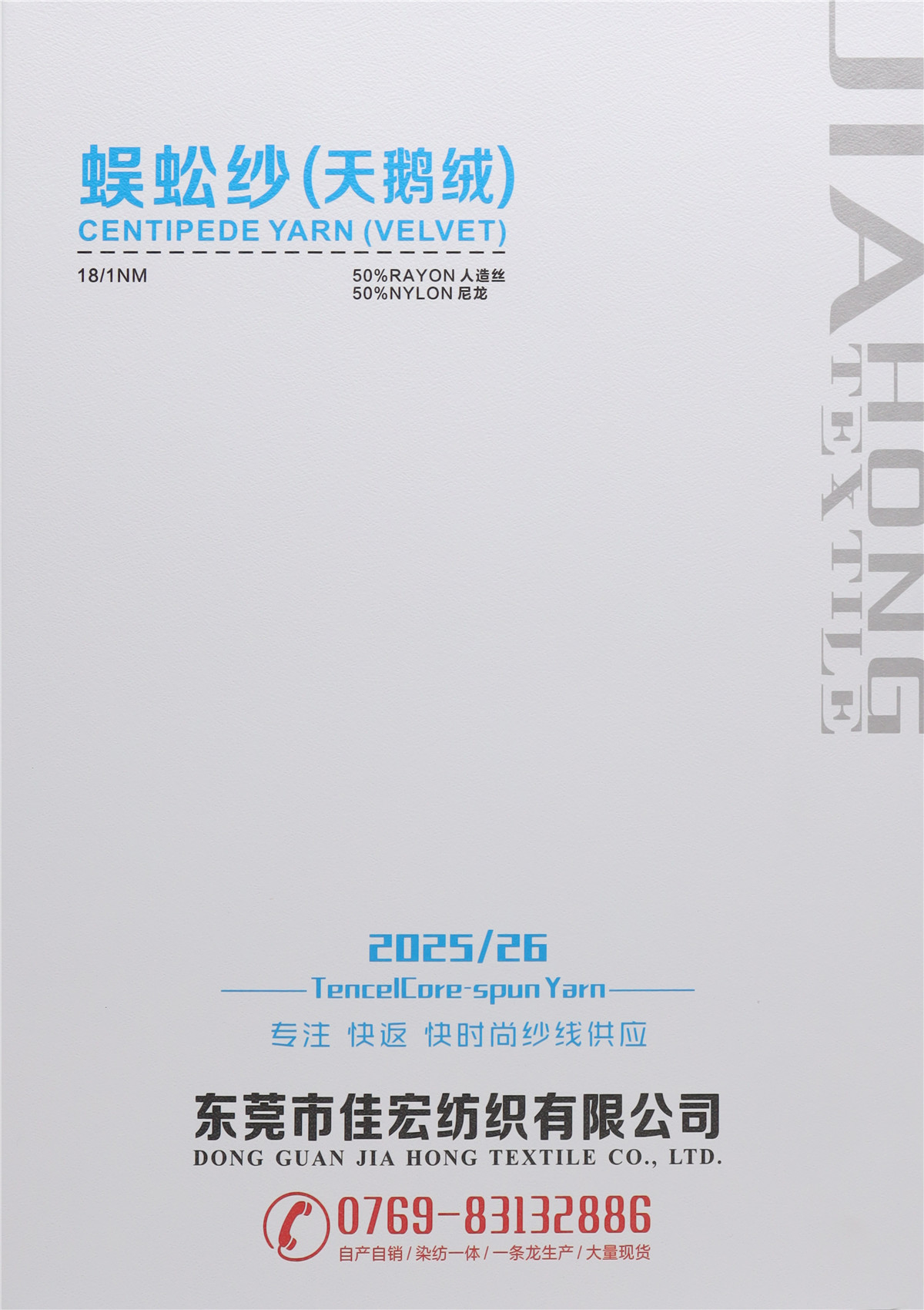 主营:一.包芯纱系列 抗起球腈纶包芯纱 天丝包芯纱 莫代尔包芯纱 AB包芯纱 七彩包芯纱 银丝包芯纱 高弹包芯纱 高捻包芯纱 二.春夏系列 兰精天丝,曲棉 七彩冰麻 高端亚丽爽 抗起球天丝棉 抗起球莫代尔棉 三.新型纱系列 亲肤绒 柔软小呢绒 色纺樱花绒 色纺纤柔纱 柔软小米绒 四.花式纱系列 仿貂毛,蜈蚣纱 雪尼尔,单边绒 五.功能性纱线 柔软小米绒 优丝棉