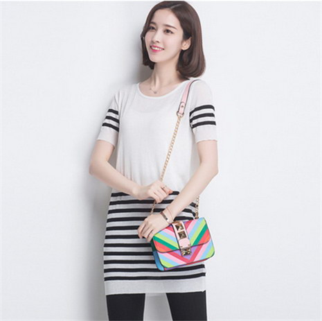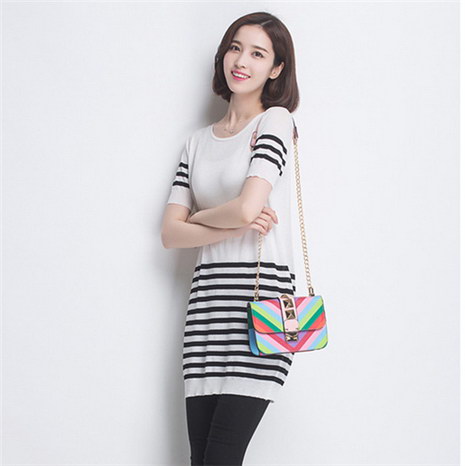 条纹中长款针织衫连衣裙女夏季薄款桑蚕丝短袖T恤修身打底衫上衣