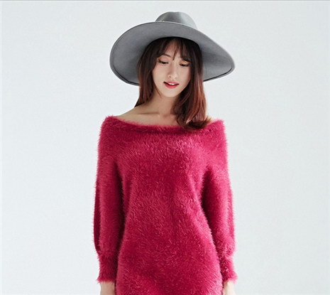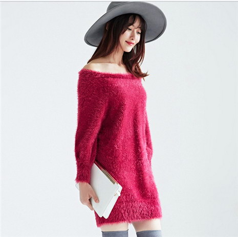 甜美修身长袖一字领中长款针织毛衫