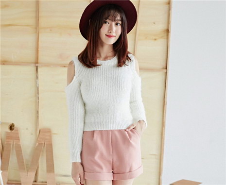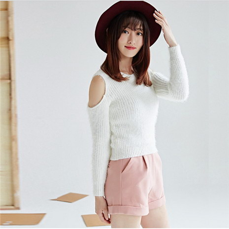 春秋款韩版时尚甜美长袖露肩圆领优雅毛针织衫毛衣