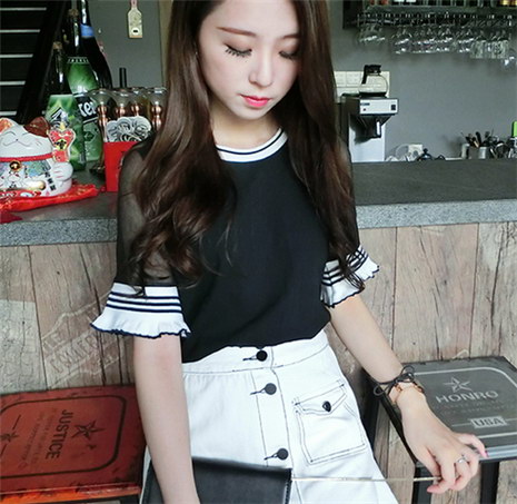 黑色荷叶袖 套头薄款夏季针织衫