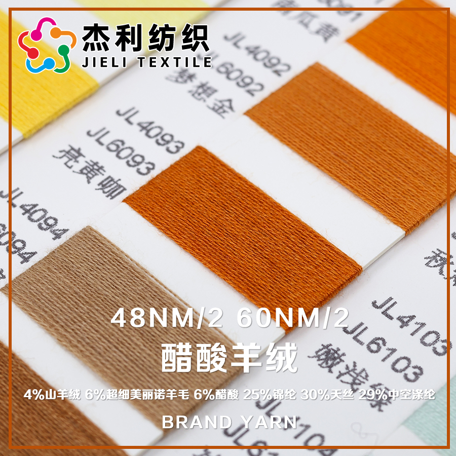 4%山羊绒 6%超细美丽诺羊毛 6%醋酸 25%锦纶 30%天丝 29%中空涤纶