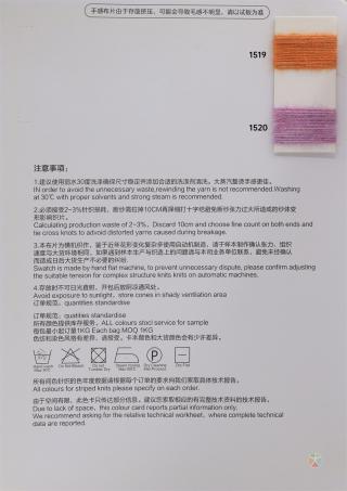 主营:春夏系列:30S/2高捻包芯纱、2/48NM羊毛麻点纱、2/48NM幻彩亚麻、1/28NM高捻冰丝、1/28NM新变冰丝、2/48NM纯棉包芯纱、2/52NM晴棉包芯纱、2/28S高弹包芯纱;秋冬系列:2/52NM香奈绒、2/50NM爱玛绒、2/18S北极绒、2/26S超细北极绒、1/30NM超细羊驼毛、1/14NM色纺牛绒、1/15NM色纺磨毛纱、1/16NM彩虹纱