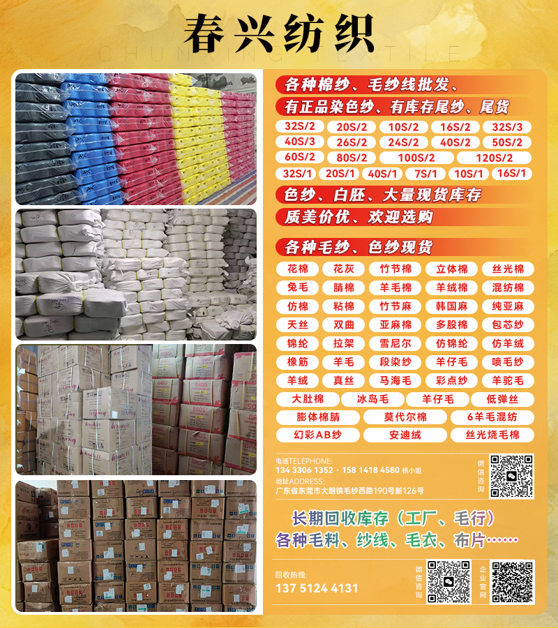 各种棉纱批发, 有正品染色纱, 有库存尾纱、尾货,长期回收库存 (工厂、毛行): 各种毛料、纱线 毛衣、布料、布片