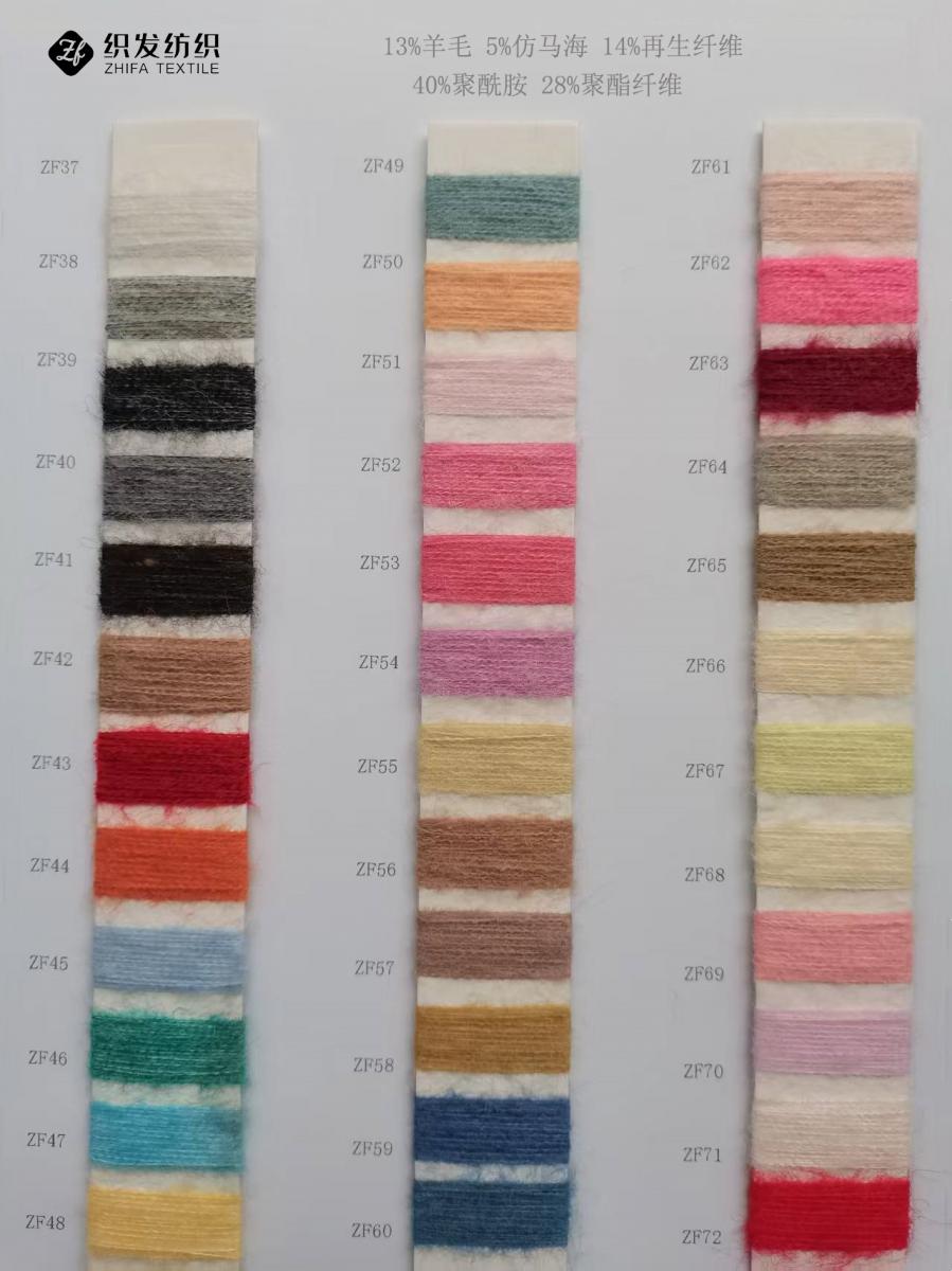 13%羊毛 5%仿马海 14%再生纤维 40%聚酰胺 28%聚酯纤维